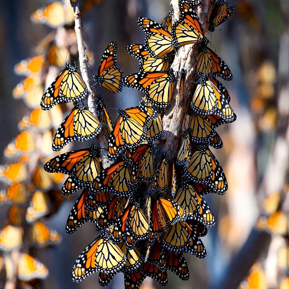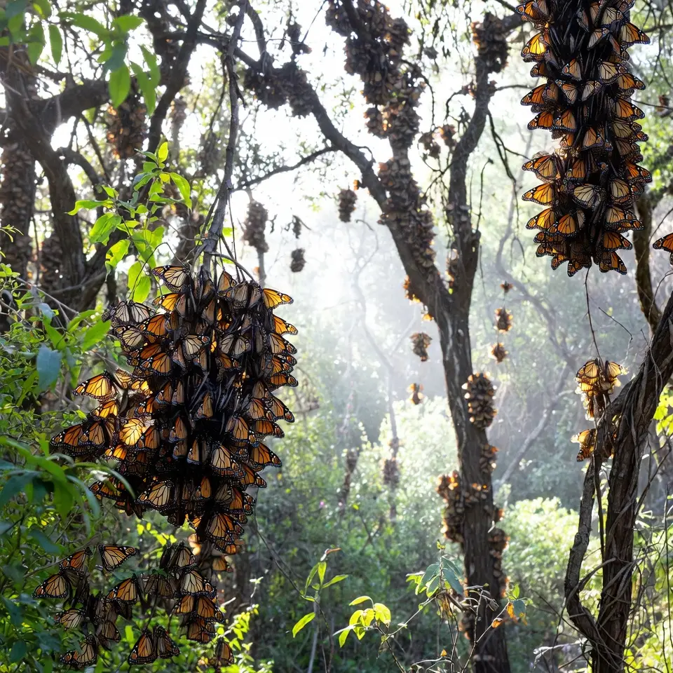 To visualize these overwintering phenomena, consider the dense clusters formed in Mexico’s forests and California’s groves: